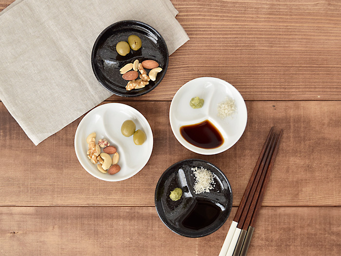 こちらのプレートは、仕切りがあるので複数のお皿を使わずに薬味、醤油、ソースなどの使い分けができます。 色も白と黒の2色あり、ちょっとしたおつまみの盛り付けなどに使うとおしゃれ。食洗機・乾燥機の使用もOKなので、普段使いもしやすいですよ。