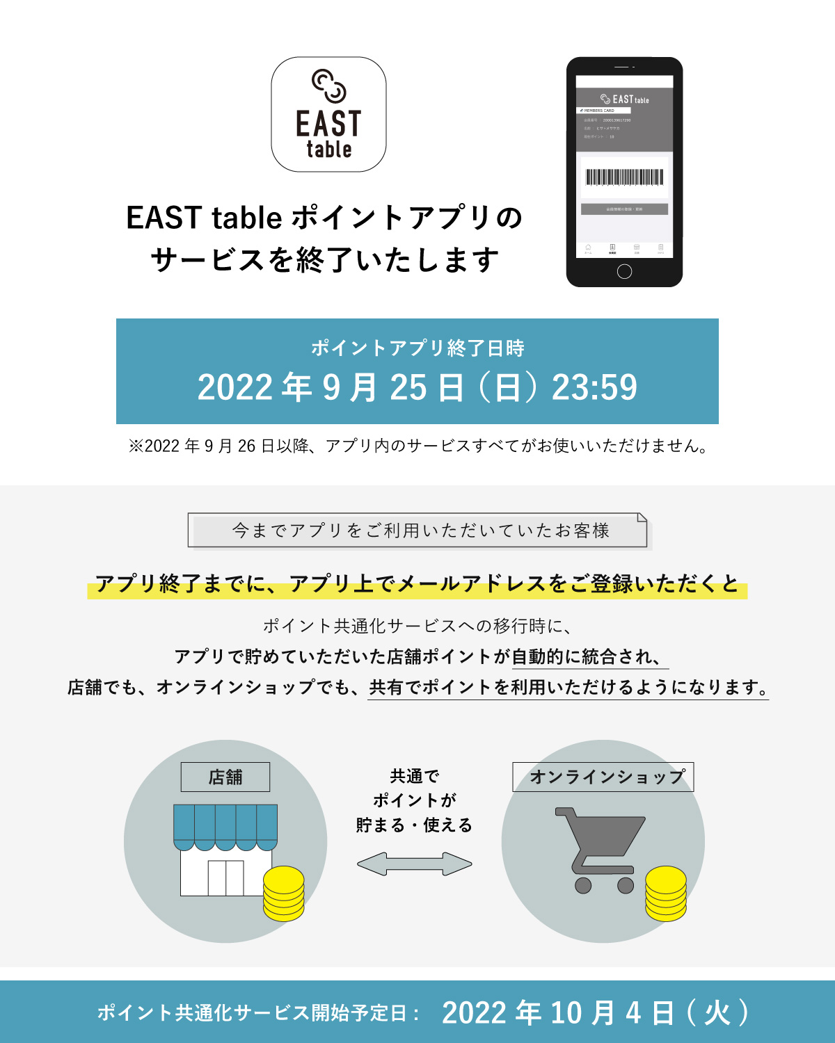 いつもEAST tableをご愛顧いただき、誠にありがとうございます。