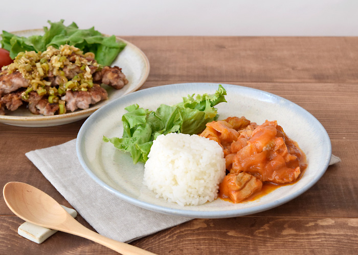 深さがあるので少し汁気のある豚の生姜焼きの盛りつけにぴったりです。