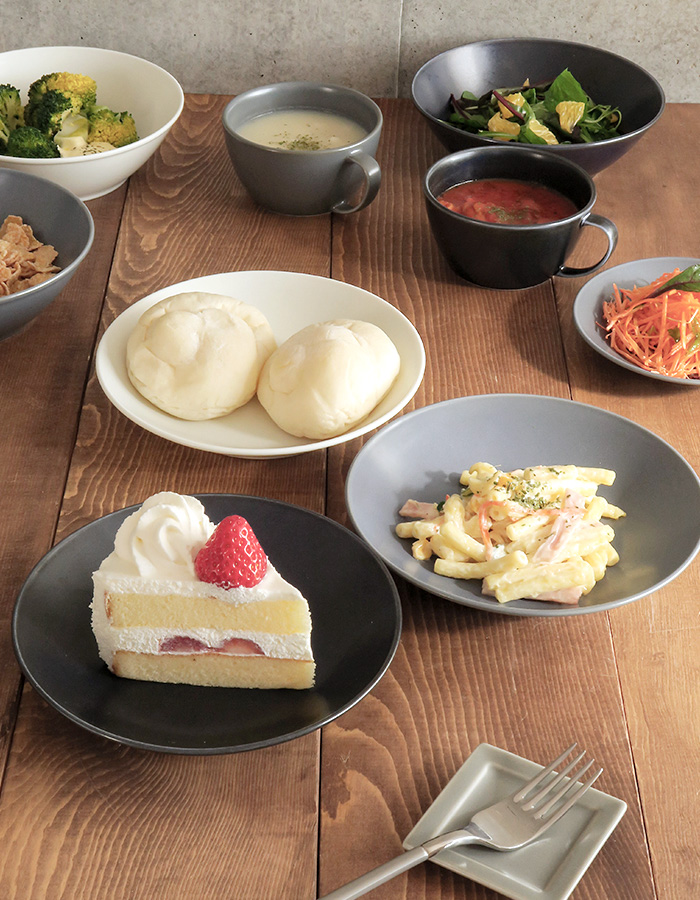プレーン・ブルーグレー・インディゴの落ち着きのある3つのカラーは、おうちカフェとして個性的なテーブルコーディネートも楽しめますよ。