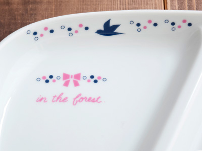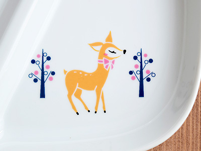 子鹿の他にも、うつわのアクセントとして、リボン、木の実を模したドット模様、鳥などが散りばめられており、女の子の好きなカワイイモチーフをぎゅっと詰め込んだデザインになっています。