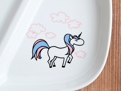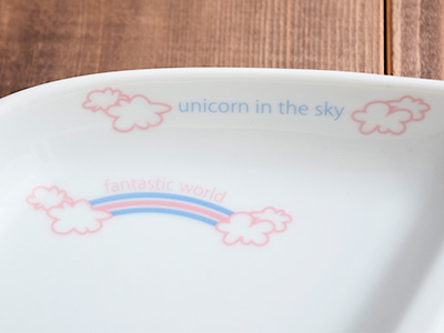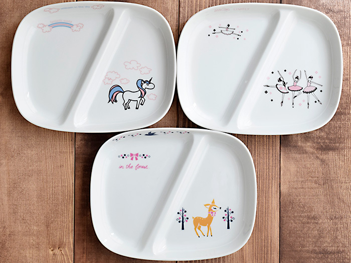 優しいカラーの女の子用食器。「ユニコーン」「バンビ」「バレリーナ」のかわいらしい3種類のイラストからお選びいただけます。