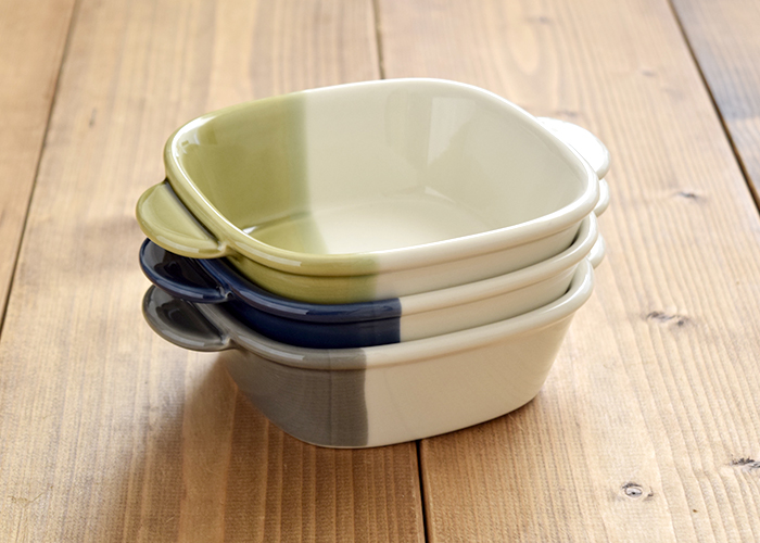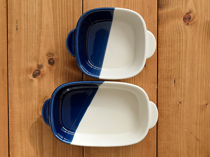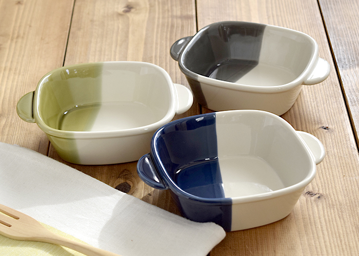 落ち着きのあるバイカラーの塗分けが、さりげないおしゃれを演出してくれる、四角い形のグラタン皿。