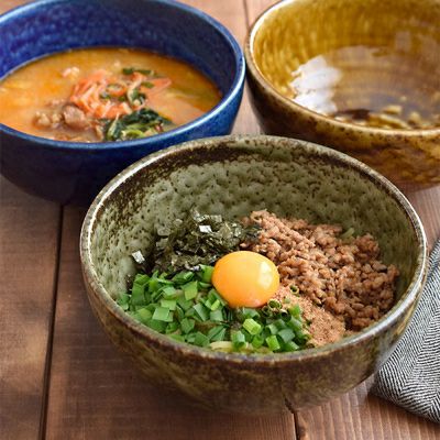 イラボ(伊羅保)という作風で、鉄分の多い砂状の粒が釉薬に入っており、そのかかり具合は一つとして同じものがない、器ごとに表情が異なる器です。こちらは少し大きめのサイズ。うどんや蕎麦など1玉では足りない男性や、具沢山のラーメンやちゃんぽんなどに使える大きさの丼ぶり。