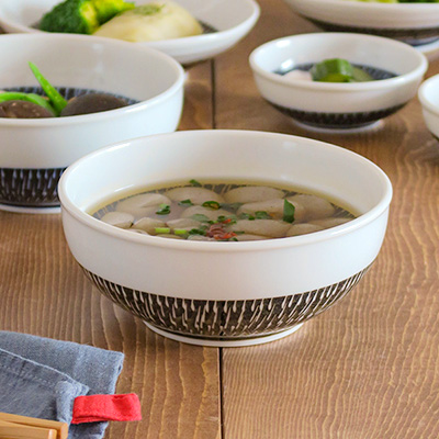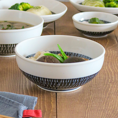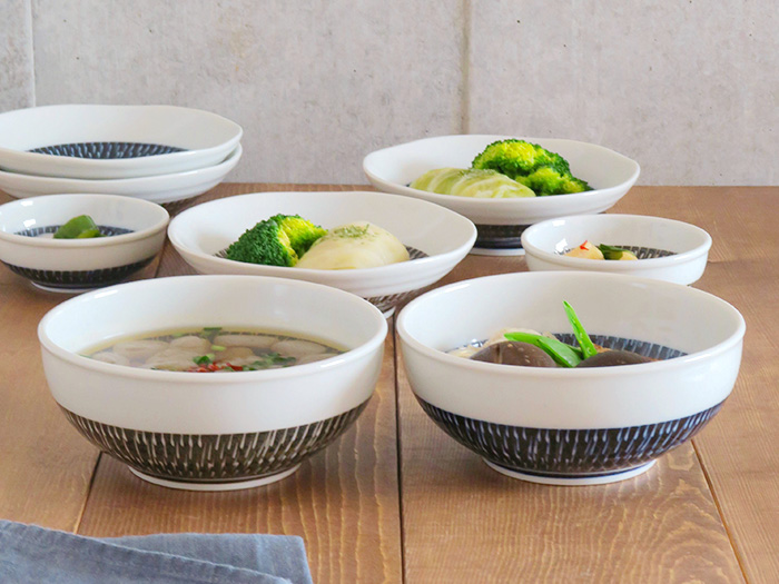 手頃に使える白い素地に、巻き付けたような太いラインが和食器らしい存在感。食卓にも違和感なく馴染んでくれますよ。