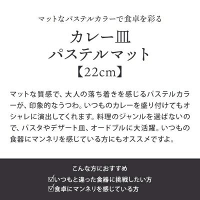 マットな質感とやさしい色の器は食卓に上品さを加えてくれます。カラーは淡い優しい色合いを揃えました。小さいサイズのお皿ですので、たくさん揃えてちょっとしたおかずや前菜皿・副菜皿にも最適です。