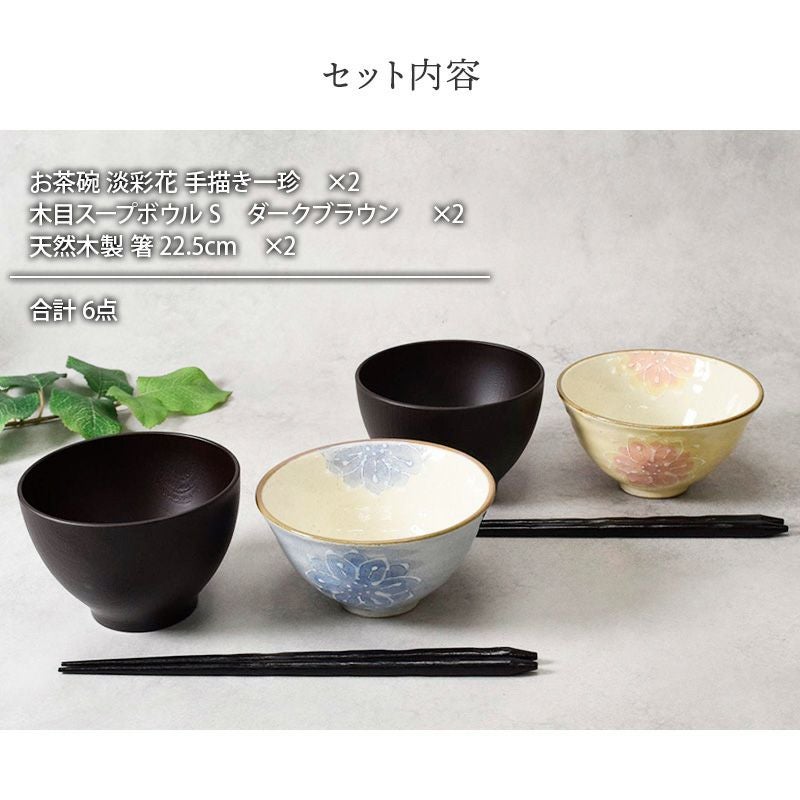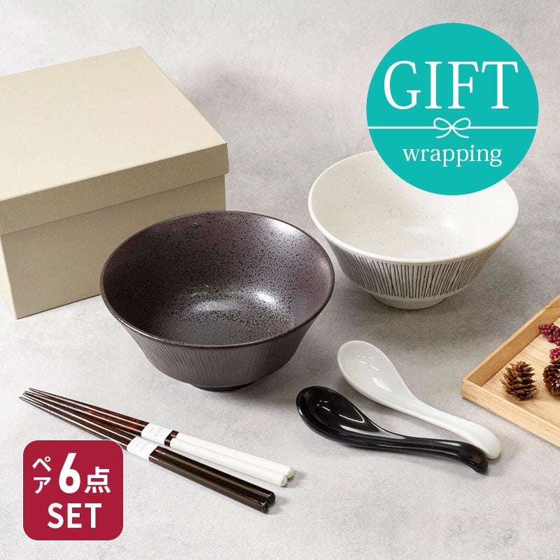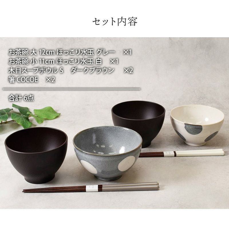 【送料無料】 優しい雰囲気が人気の「ブラウンベルト」のお茶碗2点、モダンなお椀2点、木製のお箸2点、合計6点のギフトセットです。 職人がひとつひとつ丁寧に造った茶碗は優しい手触りで、色合いや柄のつけ方や釉薬のムラ、鉄粉の有無、形状やサイズについても、どれ一つ同じものはありません。そういったところも、こちらのお茶碗の魅力の一つです。 お茶碗は、ちょっぴり可愛さをプラスした「水玉」と落ち着いた雰囲気の「ボーダー」柄の2種類から選べるのがポイントの人気のギフトです。