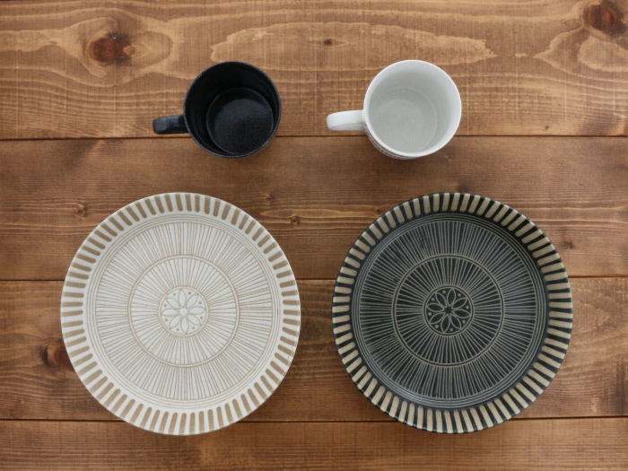 こちらのお皿は、白と黒のモノトーンカラーとおしゃれな柄が特徴のカフェ風プレートとマグカップ。