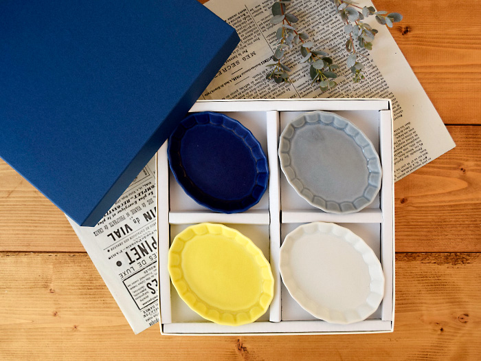 新生活祝い、結婚祝い、引っ越し祝い、内祝い、お誕生日プレゼントなどにオススメ。お皿4枚をボックスに入れた、ギフトセットです。