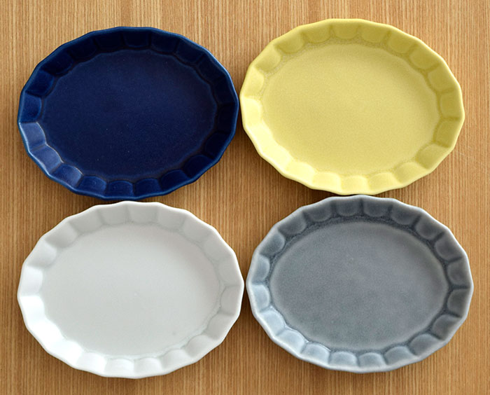 SNSなど写真映えもバッチリな、人気の楕円型小皿4色セット。マットな質感で、高級感を感じる雰囲気。