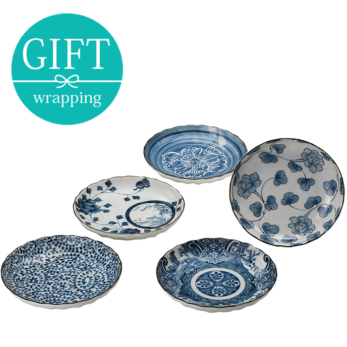 【有料ラッピング対象商品】絵柄も楽しめる和食器ギフト。 中皿5枚セット 16.5cm 染付絵変り 化粧箱入り ギフト