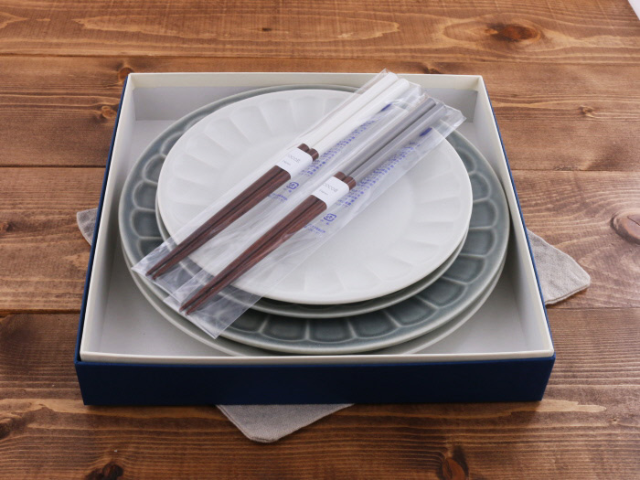 大人気「しのぎ お花のリムプレート」シリーズと、Estmarcの「COCOE」箸をセットにした、箱入りの食器ギフト。