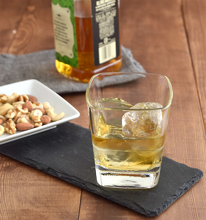 グラスの底部分が厚く作られており、形状はやや台形型。安定感があるので大きめの氷を入れても安心です。 写真のように、スレートプレートの上に乗せてもうっかり倒してしまう心配がありません。