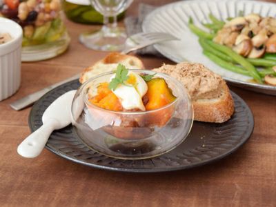 宙に浮いたようなおしゃれな盛り付けが楽しめる、二重構造のガラス製カップ。約90ccのこのカップは、サラダカップや、前菜鉢にオススメ。プレートの上にディップソース入りのこのカップを置いて、カフェ風にしてもおしゃれですよ。