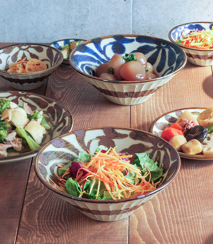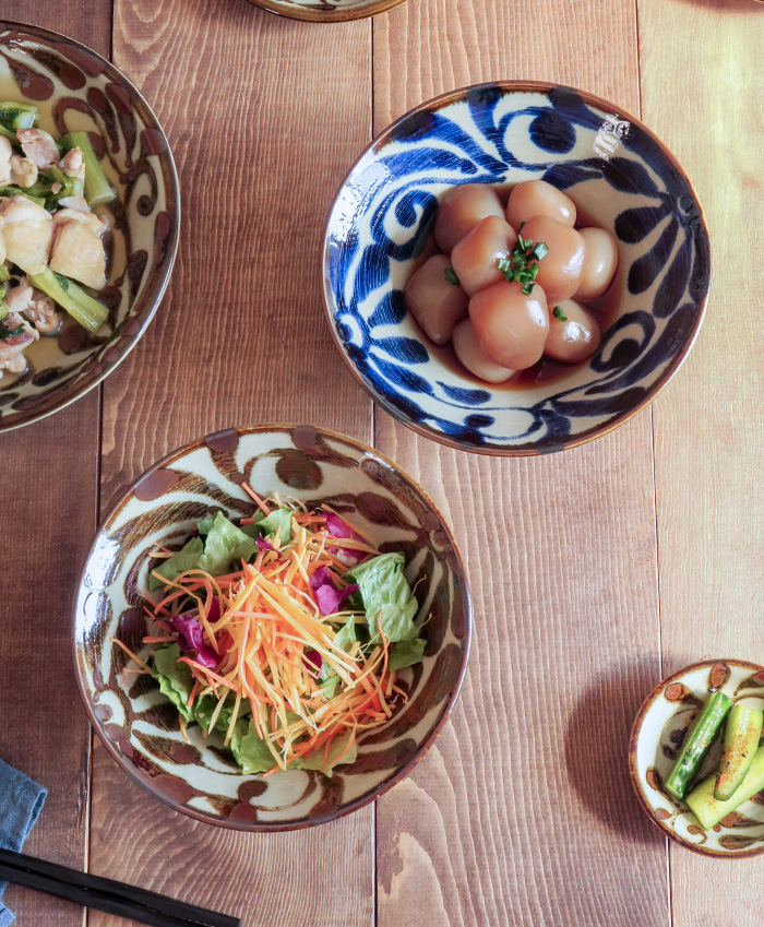 内側に描かれた模様は、ブラウンカラーのサビ色と、染付風のルリ色の2色。落ち着きがあって並べてもうるさくならず、和カフェ風のおしゃれな食卓を演出してくれます。