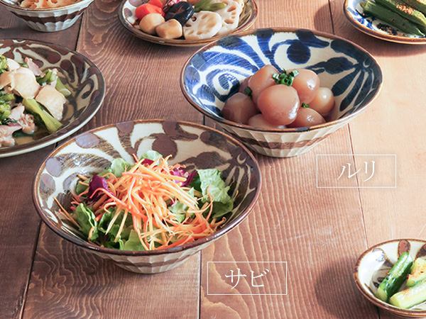 カラーは、ルリ色とサビ色の2色。どちらの模様も手描きで描かれたような濃淡やにじみがあり、同じカラーでもうつわによって違った表情を見せてくれます。一枚いちまい、自分だけのお気に入りの食器としてご愛用いただけますよ。