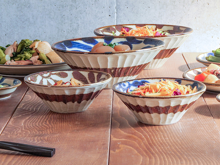 内側に描かれた模様は、ブラウンカラーのサビ色と、染付風のルリ色の2色。落ち着きがあって並べてもうるさくならず、和カフェ風のおしゃれな食卓を演出してくれます。