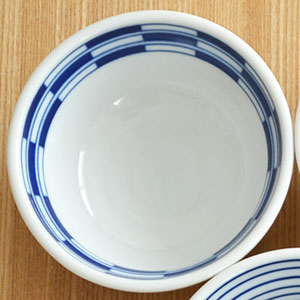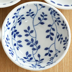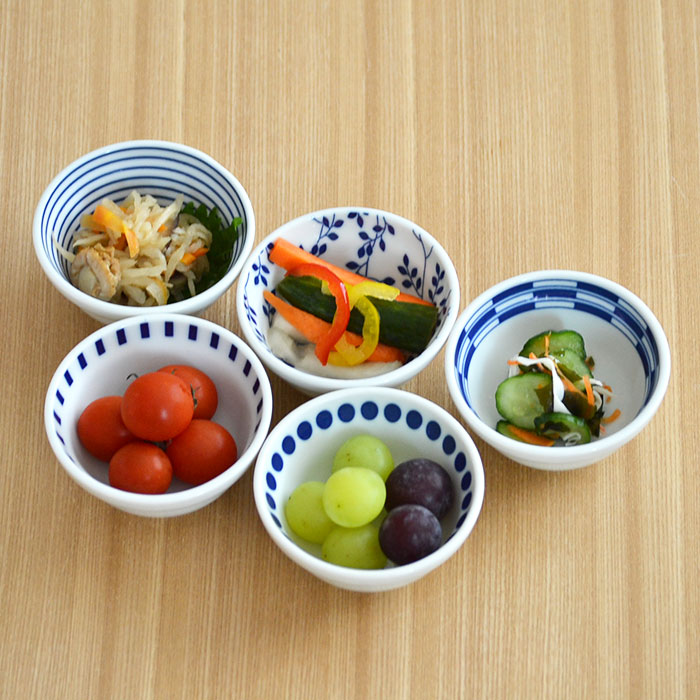 白地に瑠璃色の柄が入った小さめの小鉢。どの柄も飽きのこない柄で思わず柄違いで使いたくなる5種類。