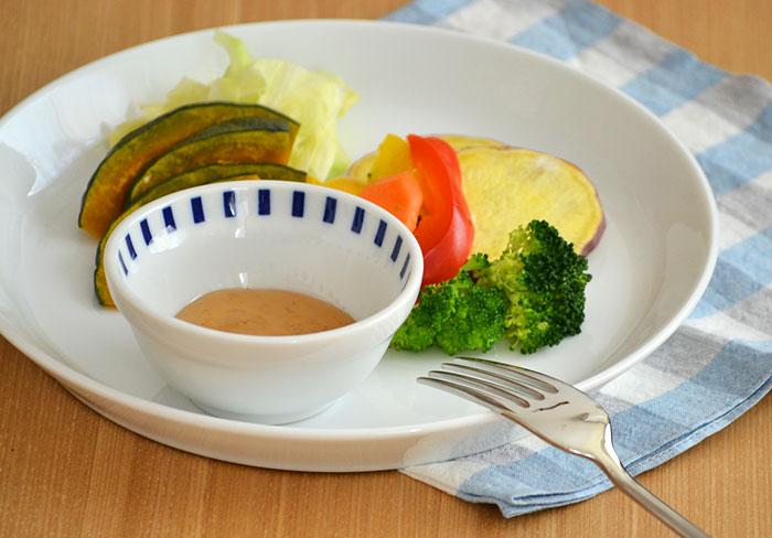 温野菜のソースを入れて。深さがあるのでたっぷり入ります。