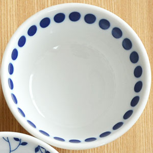 白地に瑠璃色のシンプルな柄が食卓を明るくしてくれる、小さな小鉢です。漬物・おしょうゆ皿、ソースやディップ入れに、お浸しや和え物などの副菜の盛りつけに活躍します。おつまみをちょこちょこのせて、テーブルに乗せても可愛いですよ。