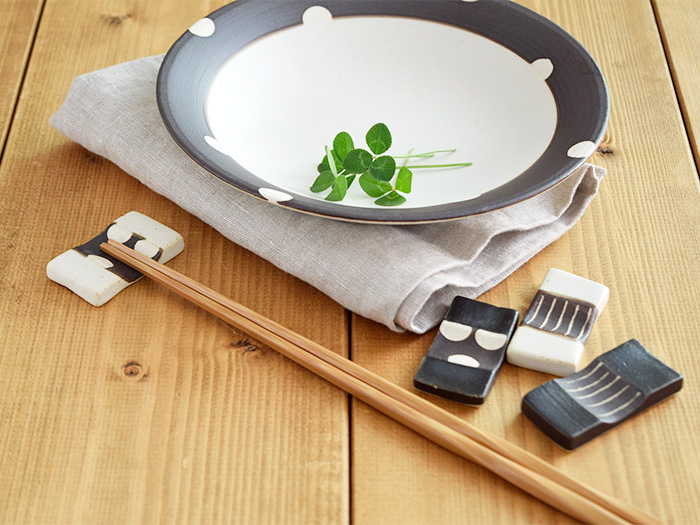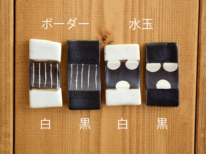 職人がひとつひとつ丁寧に造った器は、自然の味わいがあって優しい手触り。 箸置きの模様も、職人さんが1つ1つ手で書いたものです。 なので、水玉の位置が違ったり、ボーダーの向きが物によって違ったりと、その箸置き1つ1つに特徴があります。