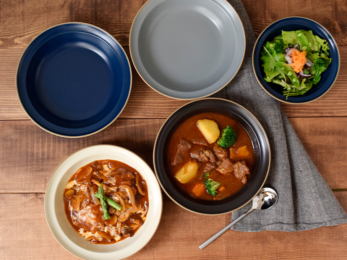 黒い器のせいかビーフシチューやカレーが豪華に見えます。白い色のシチューはコントラストが出てワンランク上の食事に見えます。