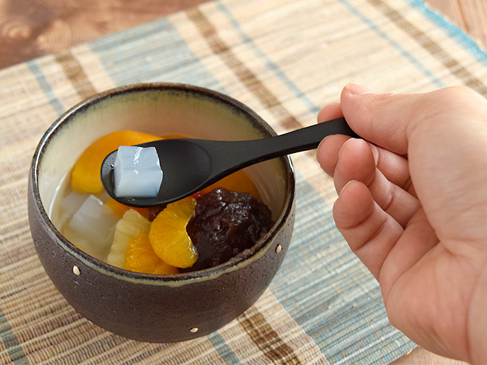 匙の部分は、楕円の形になっており、滑りやすい杏仁豆腐や寒天もしっかりすくえます。