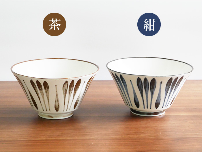 ゴスの青色、サビの茶色、どちらも優しく温かみのある色合いで家族人数分、色違いで揃えるのもおすすめ。 無地の器に柄物の器を加えるとテーブルがぐっと引き締まるので他の器とのコーディネートも楽しんでみてください。