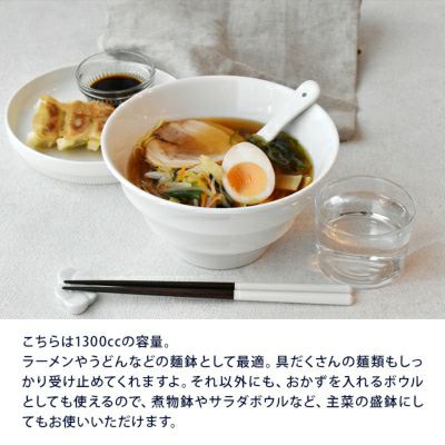 こちらは1300ccの大鉢サイズ。しっかり深さもあるのでラーメン、うどん、アジアン料理などの麺鉢として最適。丼ものでは親子丼、かつ丼の和食にはもちろん、ロコモコ丼などの洋風丼ものメニューにも合わせやすい丼ぶりです。大鉢として、煮物鉢、サラダボウルなどにも重宝しますよ。デザイン性と機能性にも優れた丼は、毎日使いたくなるアイテムです。