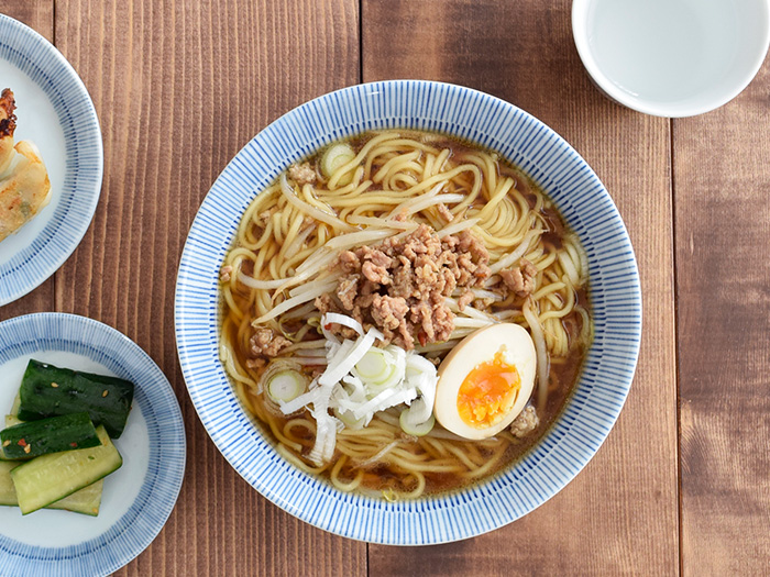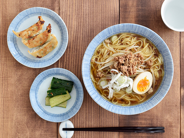 ブルーで描かれた細い十草が、麺もスープも具材も引き立ててくれる、シンプルなラーメン丼ぶり。
