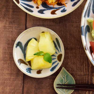 約8.8cmの豆皿サイズ。醤油皿や漬物皿、薬味皿などにちょうどよく、一口サイズの副菜にもぴったり。珍味皿やおつまみ皿にも幅広く使えます。