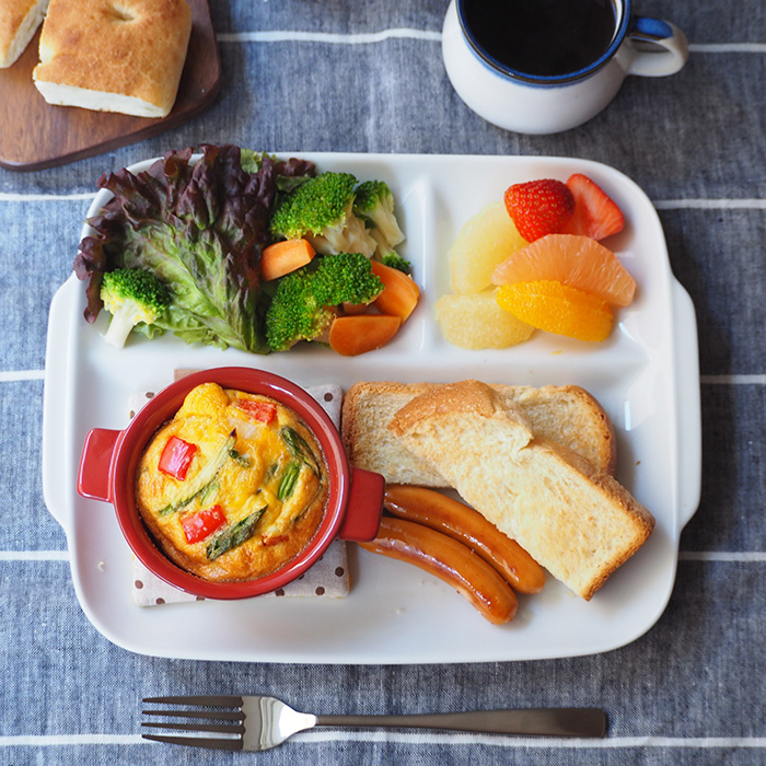 写真のように一人用のグラタンやキッシュなどを、仕切りプレートや大皿にのせてワンプレートにすると簡単にカフェ風のご飯に。