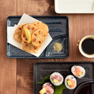 タレや調味料、薬味などを添えるのにちょうどいい小さめの仕切りがついた角皿。餃子皿やお寿司皿、天ぷら皿、刺身皿など、幅広い料理に使えます。