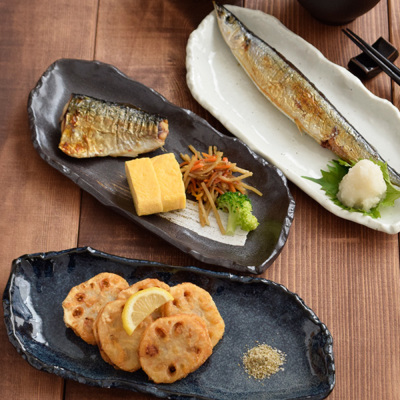 手びねり技法で作られたかのような、個性的な楕円形の長皿。サンマが一尾乗せられる大きさで、デットスペースを作りにくいスマートな食器です。