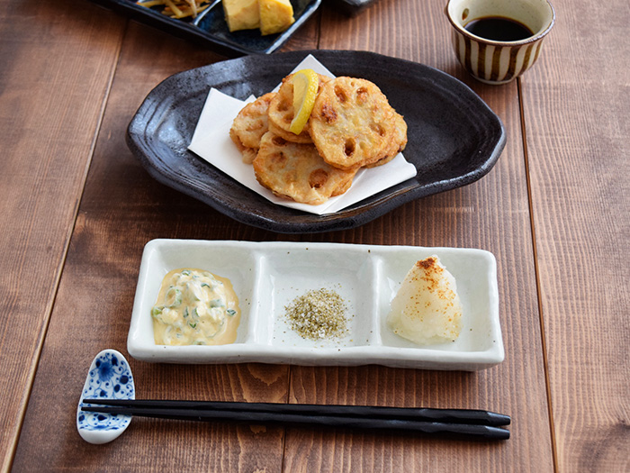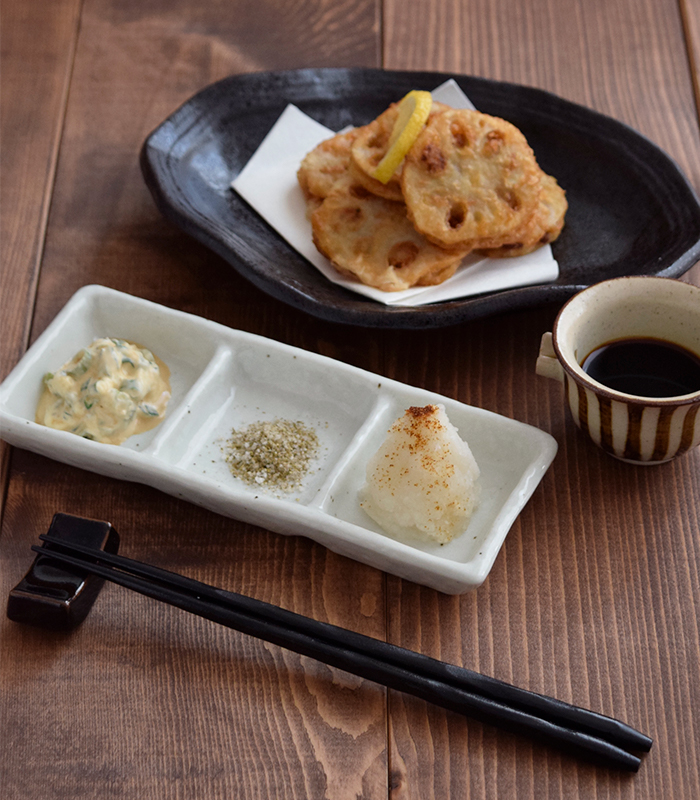 こちらの仕切り皿ひとつで、複数の調味料や薬味をお使いいただけます。