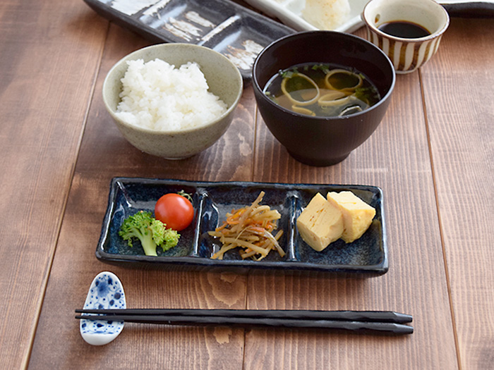 それぞれのスペースに和え物や副菜などを盛り付ければ、ワンプレートの完成!一口サイズで食べやすいので朝食におすすめです。昨日の残り物も、このうつわに移し替えるだけで上品に見えます。
