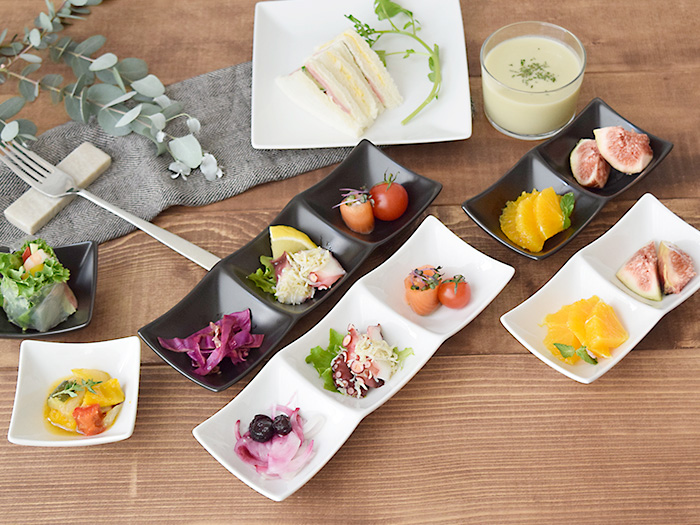 写真のように、一口サイズのおかずや前菜をちょこちょこ並べてもお洒落。 スタイリッシュかつ上品にテーブルを飾ってくれるので、おもてなしや来客時、ホームパーティなど賑やかな場面の雰囲気作りにもぴったりです。