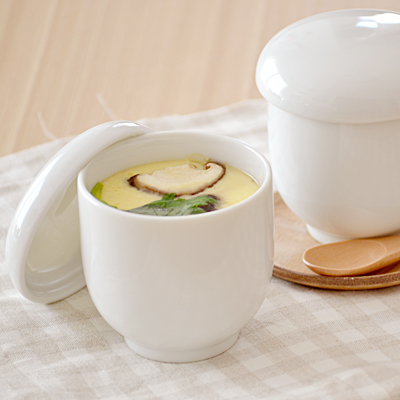 とってもシンプルで食卓に馴染みやすい、ホワイトの茶わん蒸しです。夏場には冷やして上にダシをはり、冬場は熱いままで・・・蓋付きで冷めにくいので、スープカップとしてもオススメです。