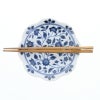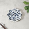 白地に濃紺の「洛悠花」模様をあしらった花型の中皿は、洗練された印象ながら温かみも感じさせるデザインです。