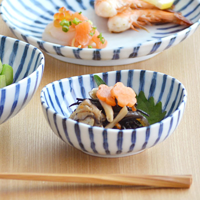 藍染のストライプ模様が爽やかな食器、「ダミ十草」シリーズ。