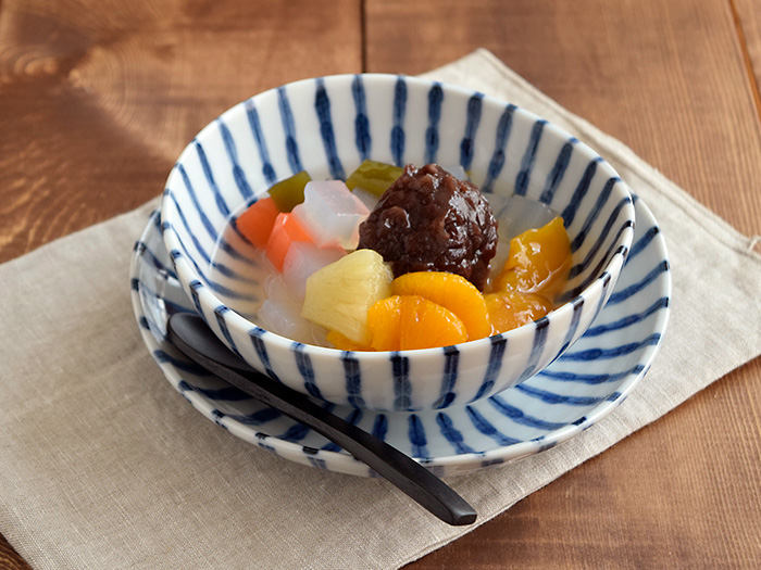 「ダミ十草 4.5寸鉢」にあんみつを入れ、ソーサーとして使ってみました。