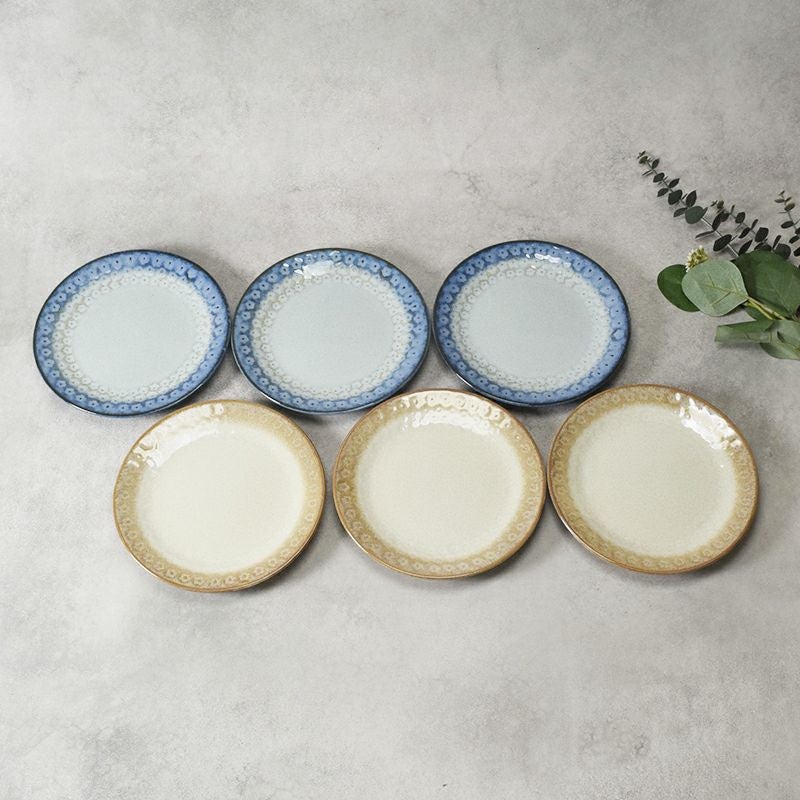 印花模様が映える、ナチュラルな雰囲気が魅力の中皿6点セット。 中皿 16.7cm スモークリース 印花型 ブルー&ブラウン 各3点 6点セット