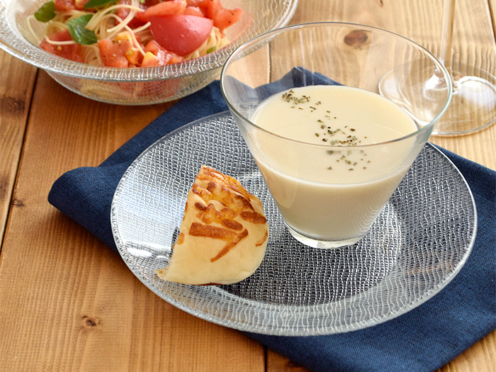 また、写真のように冷製スープを入れたボウルを乗せて、ソーサーのように使えばさらに上品なコーディネートに…。アンダープレートを下に敷くのもいいですね。ぜひ、お手持ちの食器とのコーディネートをお楽しみください。
