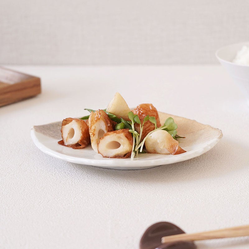 「しのぎ」という縦に素地を削ったお皿は、花びらのような模様で、盛り付けたお料理を引き立てます。