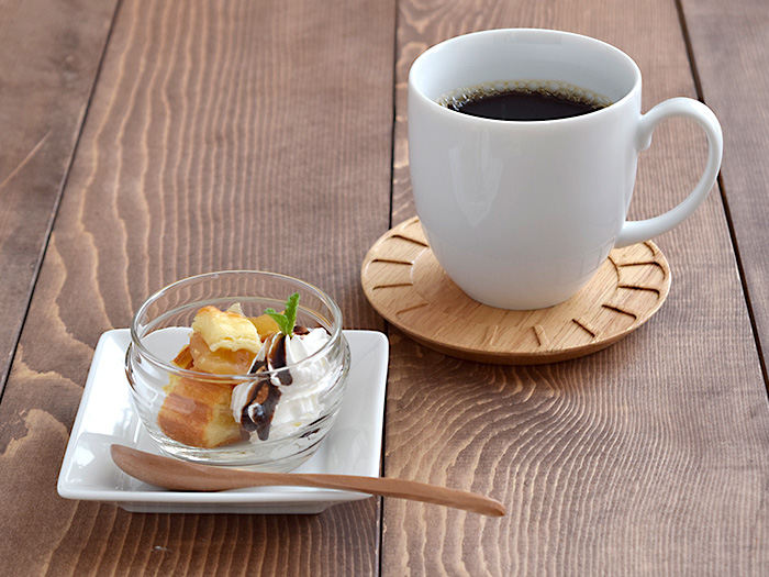 写真のように、スフレカップやデザートカップのソーサーとして使ってもOK!食卓にシャープな印象がプラスされ、カフェのようなおしゃれな雰囲気になります。