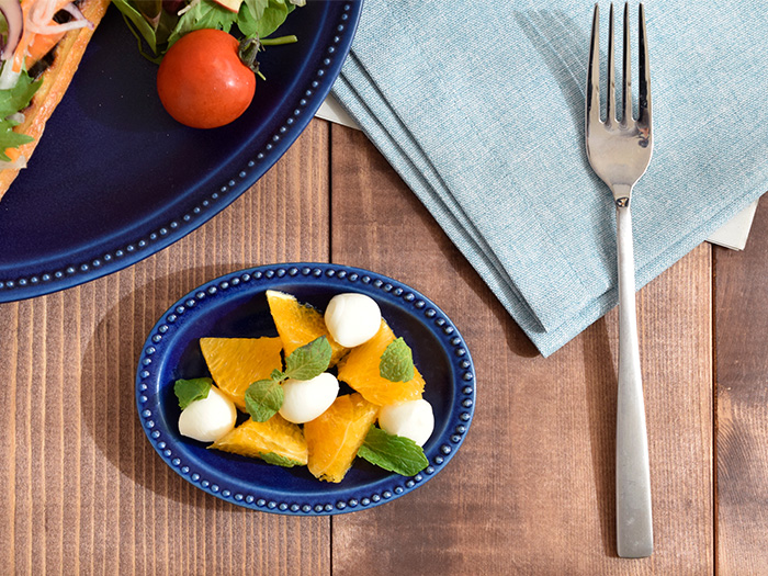 濃いめの色合いが赤や緑などの野菜や果物と相性のいいネイビー。写真映えする食器としてSNSでも人気が高く、モダンスタイルにもぴったり。
