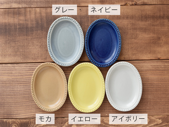 幅広い食器、料理と合わせやすいニュアンスカラー。気取らないおしゃれが楽しめる、ドットオーバルシリーズのなかでも人気のカラー。