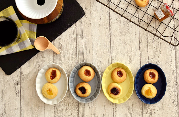 幅が約12cmの小皿サイズで写真のようにお菓子を盛り付けたり、フルーツを乗せたりサラダや和え物などちょっとした一品を乗せる、なんて時にお使いいただけます。クッキー2枚分くらいの小さなサイズが可愛らしく、使っていてちょっと気持ちがHAPPYになるような器です。