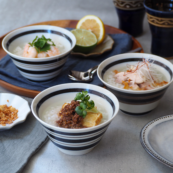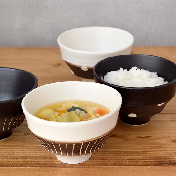 また、ご飯を盛りつける以外にも、使い勝手が良いのが、汁椀のように深型の飯椀です。 主食がご飯でなく、パンの日であったとしても、スープボウルとしてお使いいただけます。 パンにミネストローネやポトフ、シチューなど、洋食メニューにも対応。また、こういった形の茶碗を複数個揃えておけば、ひとつはご飯、もう一つはみそ汁、豚汁や餃子スープなどの具がたっぷりのメニューを盛りつけて食卓に並べてもOK。コーディネートもまとまりが出て、まるでカフェのような雰囲気に。 その他、ちょっとしたおかずやサラダを盛りつけて、小鉢のような使い方をしても良いですね。