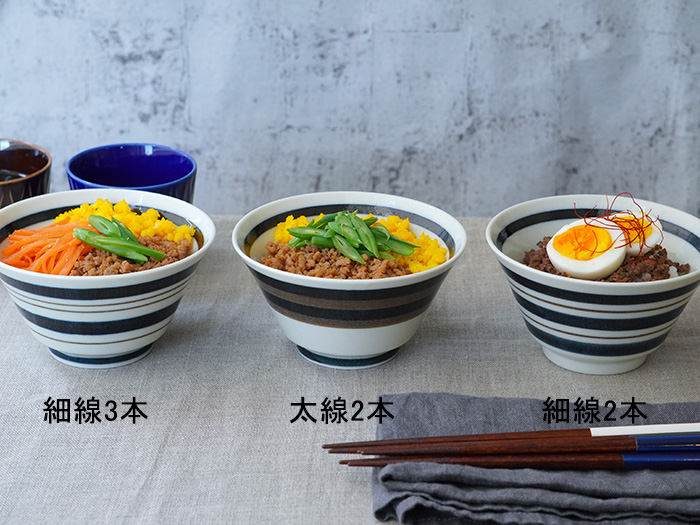 モダンでシンプルなボーダー柄を施した当店オリジナルの茶碗の3点セット。